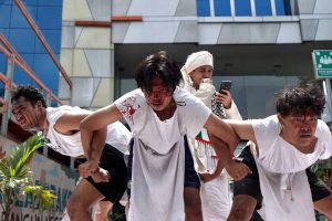 Aksi teatrikal di depan kantor Philanthropy Building, Jati Padang, Jakarta Selatan pada Kamis (12/10/2023). “Kita berharap agar kekerasan ini segera berakhir. Namun saat ini, Dompet Dhuafa membuka akses kesempatan berbagi melalui ragam kanal Dompet Dhuafa, pun via aplikasi DD Apps. Ada pengadaan kembali ambulans di sana dan sama-sama kita support alat operasi untuk medis,” sebut Prima Hadi Putra. (Redaksi/Dhika/Dompet Dhuafa)